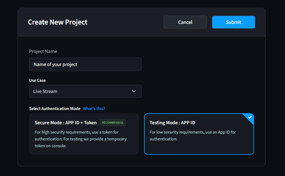 - Go to https://console.agora.io/project-management and Click on Create New and next Configure as shown in the following image