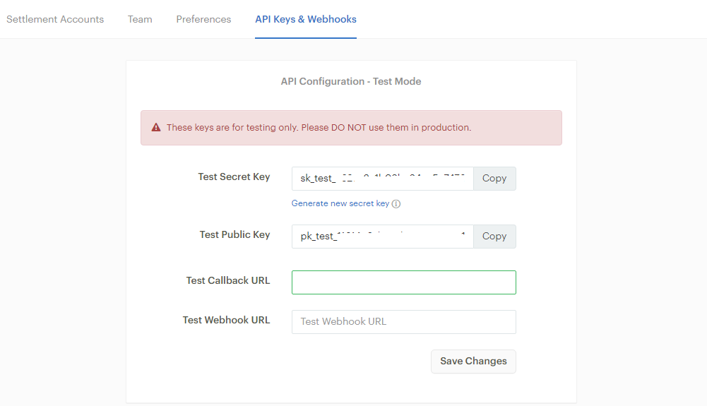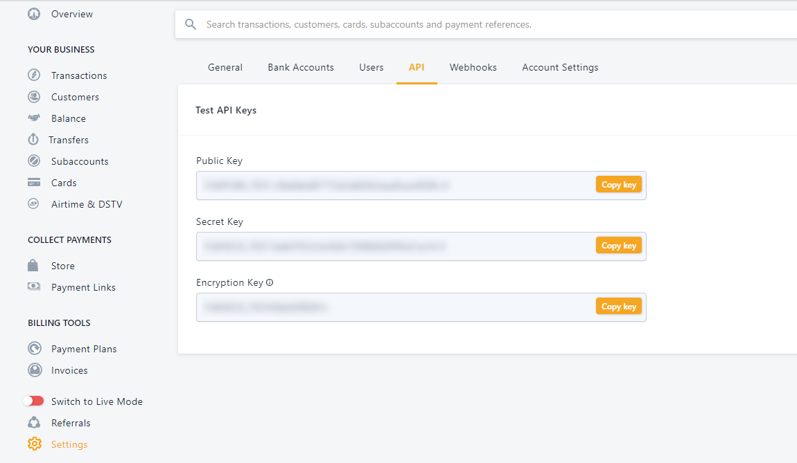- Get your API key from here https://dashboard.paystack.com/#/settings/developer